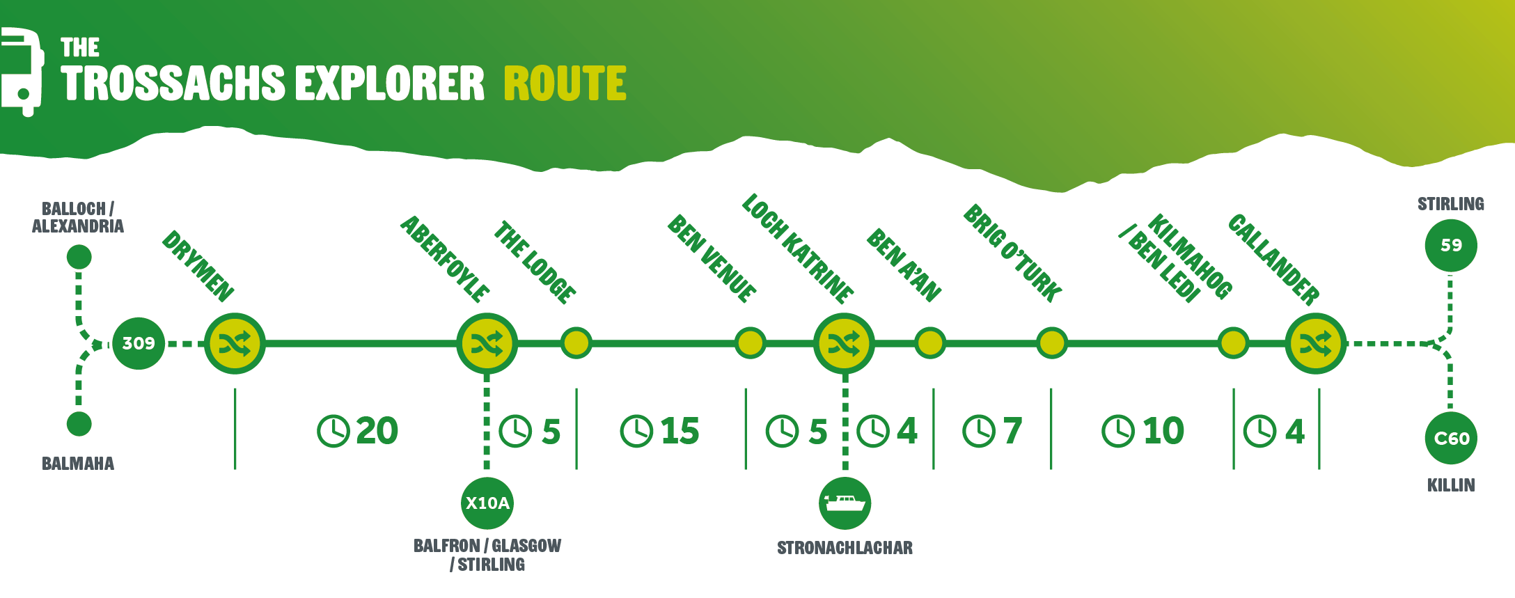 This summer, from 7 July to 5 October, the Trossachs Explorer bus is running from Drymen to Callander, connecting up villages in the Trossachs. Please follow the links below for Timetables.
